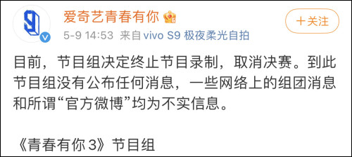 5月9日下午,@愛奇藝青春有你 節目組發博,宣佈決定終止節目錄制,取消決賽。
