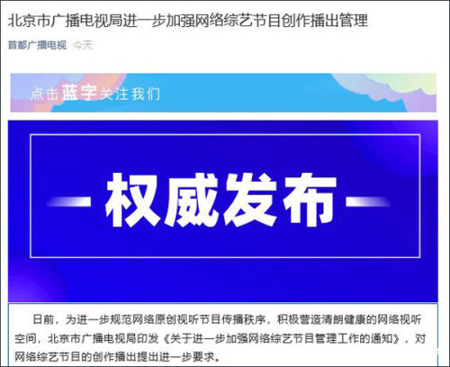 5月10日,北京市廣播電視局印發《關於進一步加強網絡綜藝節目管理工作的通知》,對網絡綜藝節目的創作播出提出進一步要求。