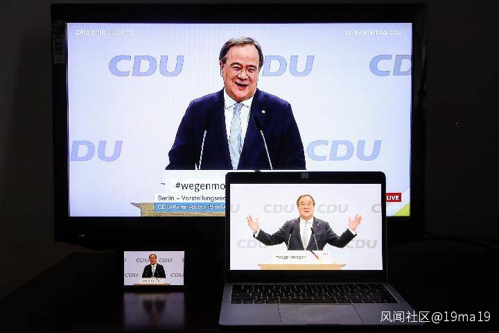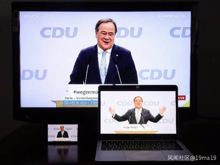 1月16日在德國首都柏林拍攝的基督教民主聯盟(基民盟)當選主席阿明·拉舍特在基民盟線上黨代會上講話的視頻直播畫面。(新華社記者單宇琦攝)
