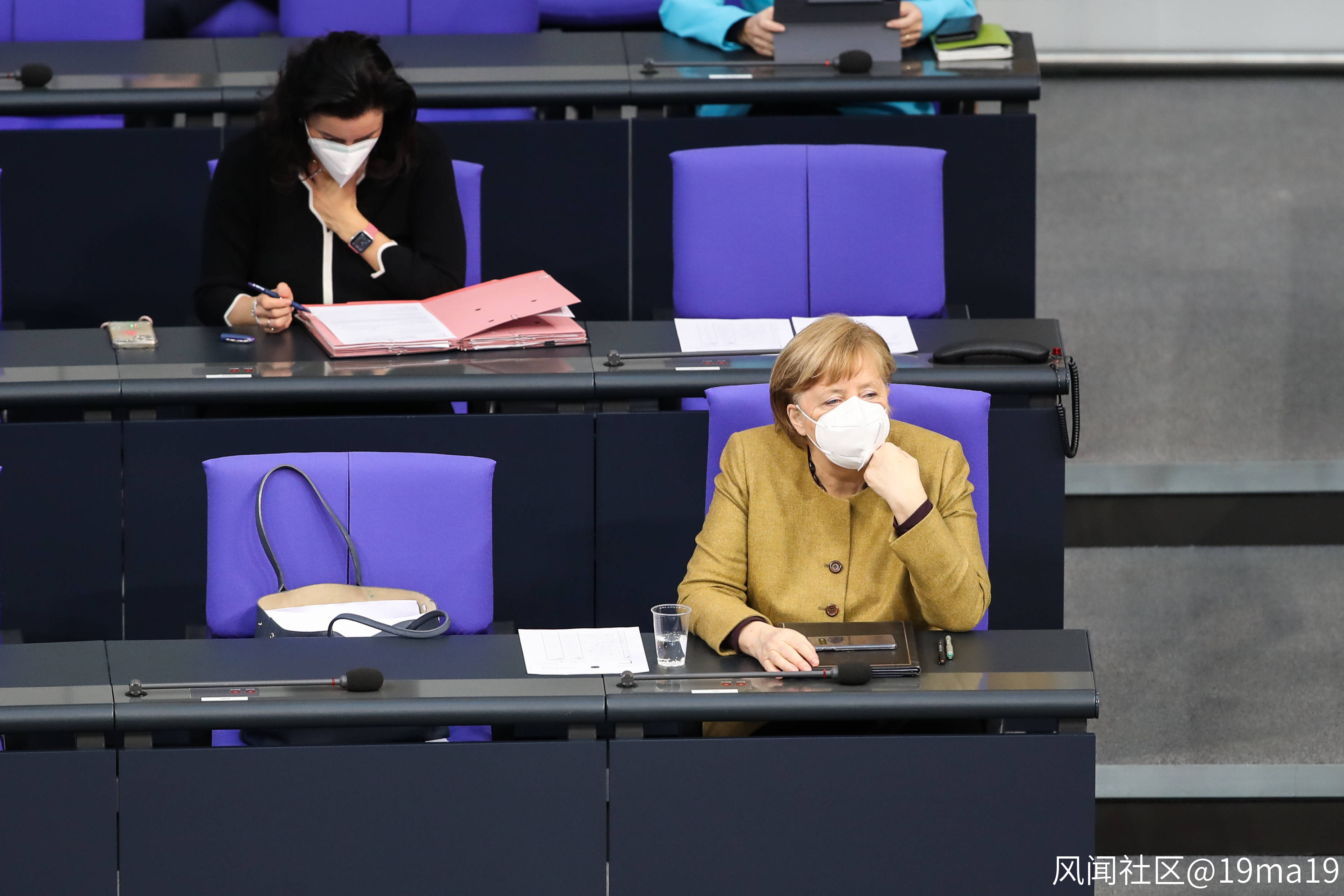 2月11日,在德國首都柏林,德國總理默克爾(右)作政府報告後佩戴口罩坐在座位上。(新華社記者單宇琦攝)
