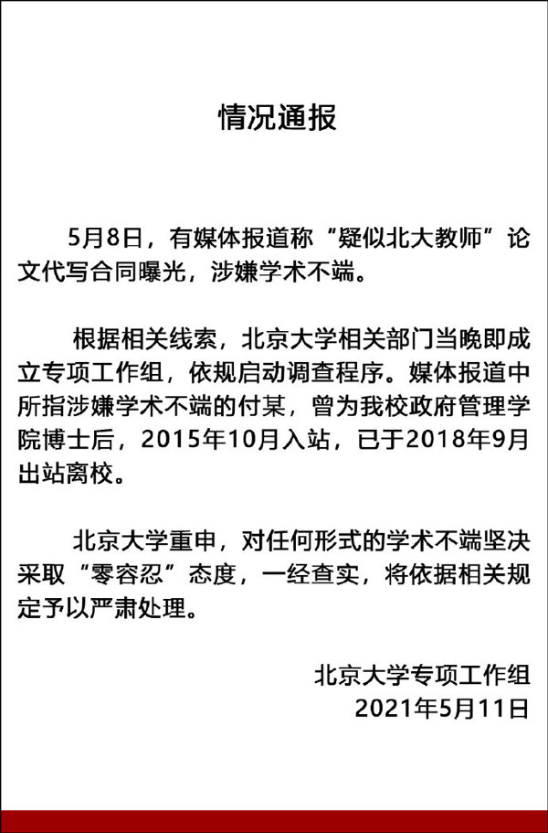 今天(5月11日)中午,對於引發關注的“疑似北大教師論文代寫合同曝光”一事,北京大學官方微博發佈情況通報稱,北京大學相關部門5月8日晚成立專項工作組,依規啓動調查程序。媒體報道中所指涉嫌學術不端的付某,曾為北京大學政府管理學院博士後,2015年10月入站,已於2018年9月出站離校。
