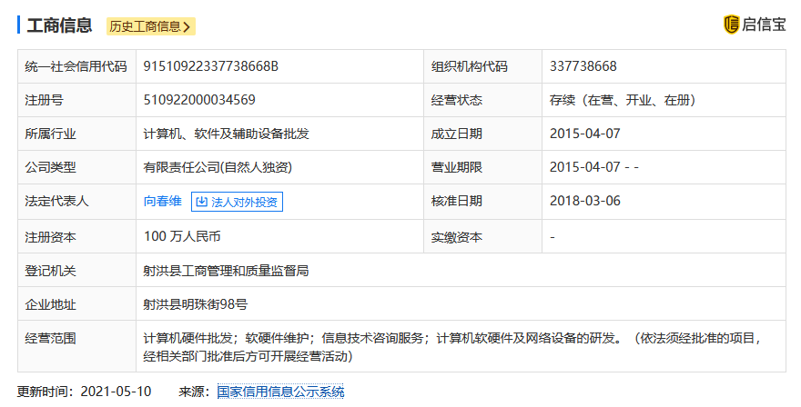 啓信寶信息顯示,合同上付睿琦委託的甲方——“百誠公司”,成立於2015年4月,經營範圍是計算機硬件批發;軟硬件維護;信息技術諮詢服務;計算機軟硬件及網絡設備的研發。