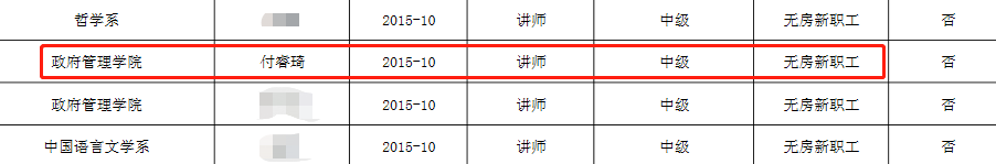 在北京大學官網的《2015年12月符合無房資格的教職工公示名單》中,可見付睿琦的姓名,顯示其為北京大學政府管理學院講師,到校日期為2015年10月。