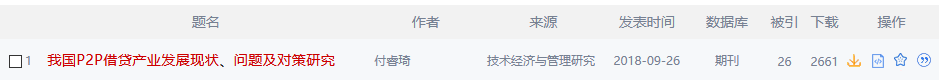 在知網查詢發現,這篇名為《我國P2P借貸產業發展現狀、問題及對策研究》的論文於2018年9月26日發表在《技術經濟與管理研究》,截至今年5月11日,該文在知網一站已被引用26次,被下載2661次。