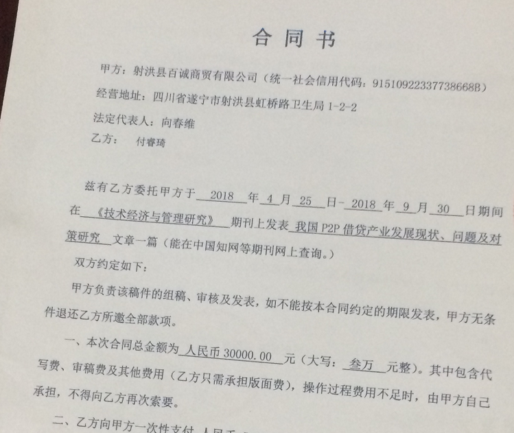 網傳的一份合同上顯示,乙方付睿琦委託甲方射洪縣百誠商貿有限公司(下文簡稱為“百誠公司”)在2018年4月25日到9月30日期間在《技術經濟與管理研究》期刊上發表論文《我國P2P借貸產業發展現狀、問題及對策研究》一篇,其中甲方需要負責稿件的組稿、審核及發表工作。