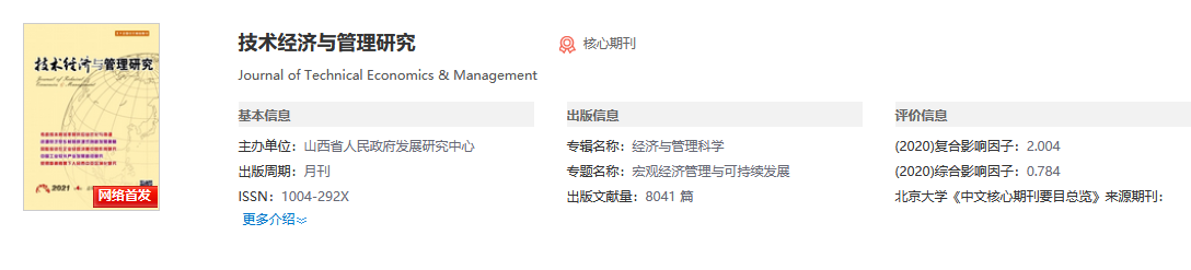 刊登該論文的《技術經濟與管理研究》,是由山西省人民政府發展研究中心主辦的專業性學術經濟期刊,被北京大學《中文核心期刊要目總覽》收錄,也就是俗稱的“北大核心”。