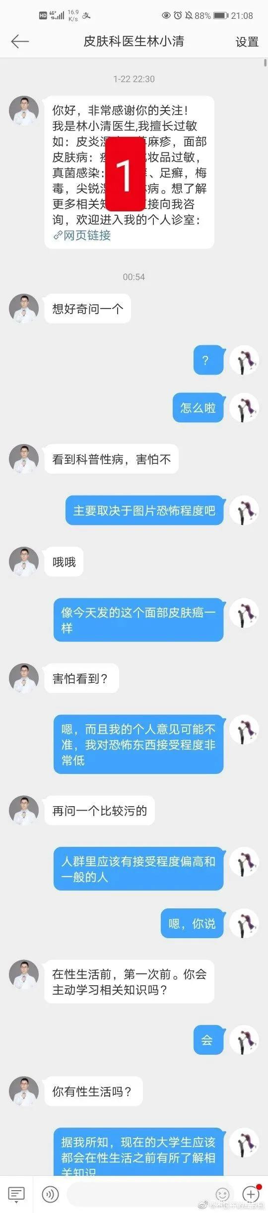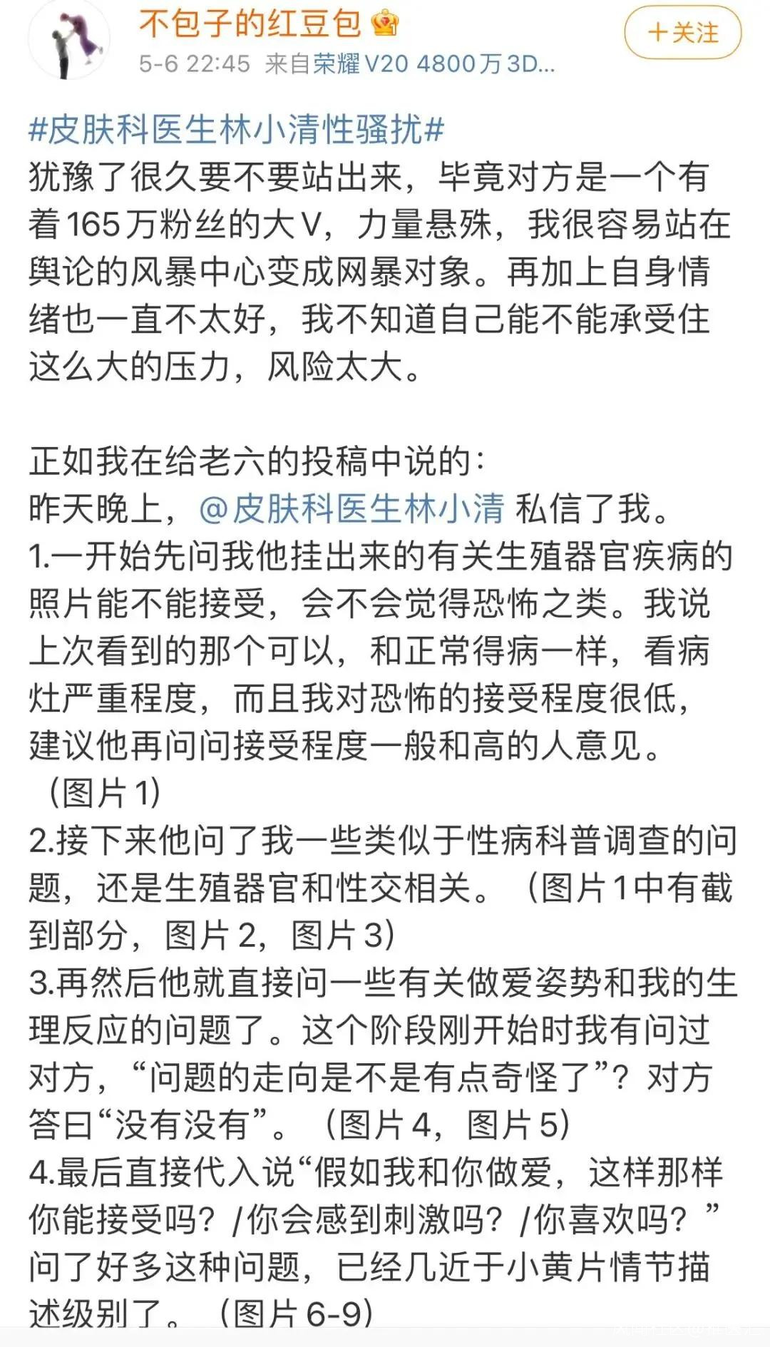 5月6日,微博網友“不包子的紅豆包”發文稱,她被微博醫療大V“皮膚科醫生林小清”私信性騷擾。私信中林小清先是以“看到科普性病是否害怕”為由進行提問,隨後就開始詢問一些露骨的私人問題。