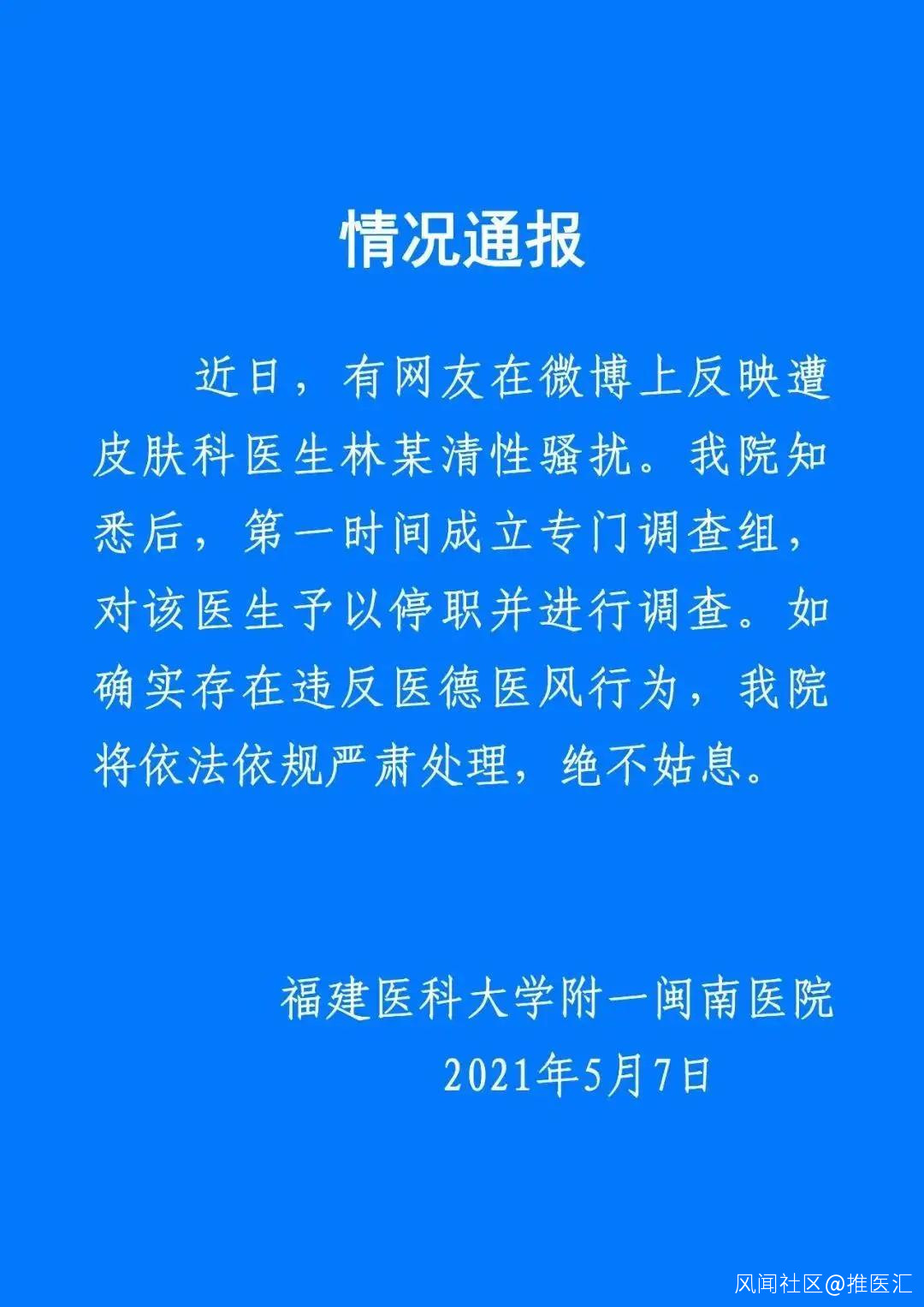 5月7日,福建醫科大學附一閩南醫院通報稱,已經成立專門調查組,對該醫生予以停職並進行調查。該醫院表示,如果該醫生確實存在違反醫德醫風行為,該院將依法依規嚴肅處理,絕不姑息。