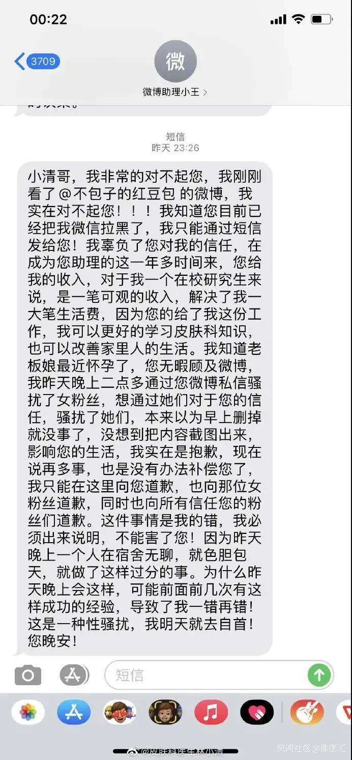 5月7日凌晨,“皮膚科醫生林小清”致歉稱自己疏於管理,種種性騷擾系其助理所為。