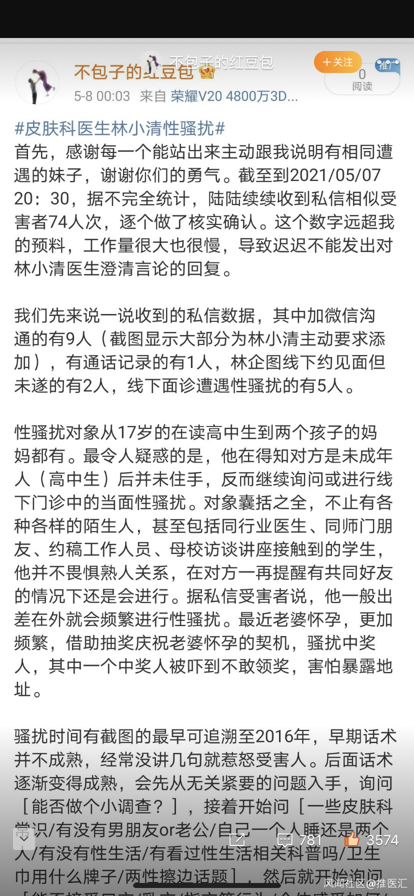 5月8日凌晨,網友“不包子的紅豆包”再發文稱,截至7日20時30分,她已收到累計74人次的受害者私信,並逐個做了核實確認,被“皮膚科醫生林小清”賬號“性騷擾”的對象從17歲在讀高中生到兩個孩子的媽媽都有。