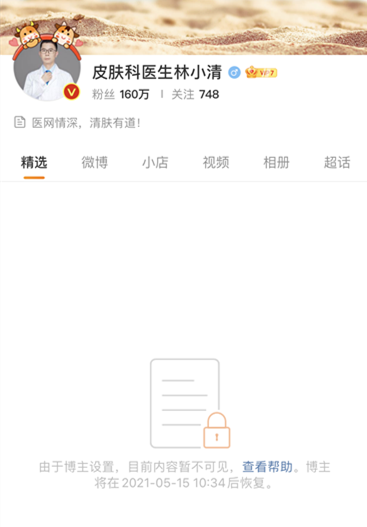 5月8日下午,小編再看“皮膚科醫生林小清”微博賬號已被設置為內容不可見。