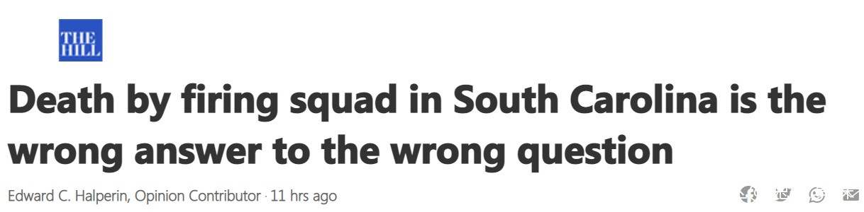 《國會山報》:南卡羅來納州眾議院本週以66票對43票的贊成票投票通過,增加了射殺隊作為該州執行死刑的方式。如果由於缺少必要的藥物而無法通過致命注射來殺死死亡,則法律要求被判有罪的囚犯在被槍斃或電死之間進行選擇。如果南卡羅來納州州長如預期的那樣簽署該法案,該州將與俄克拉荷馬州,密西西比州和猶他州一道,通過射殺隊來執行死刑。