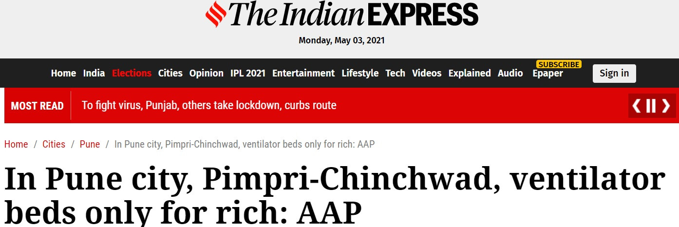 《印度快報》:在Covid-19患者牀位短缺的情況下,印度平民黨聲稱PMC和PCMC地區的呼吸機病牀“僅適用於有錢人和有影響力的人”,使它們無法進入“普通人”的視野。