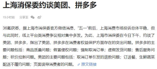 上海市消保委在10日下午,約談了美團、拼多多,指出了美團、拼多多在消費者權益保護方面存在的突出問題。拼多多的主要問題包括:商品質量問題;假冒侵權問題;強制取消訂單;虛假髮貨問題;售後服務問題;砍價拉新問題。美團的主要問題包括:取消訂單引發的退款問題;訂送餐、生鮮蔬菜配送不履約問題;頁面誤導消費者的問題。