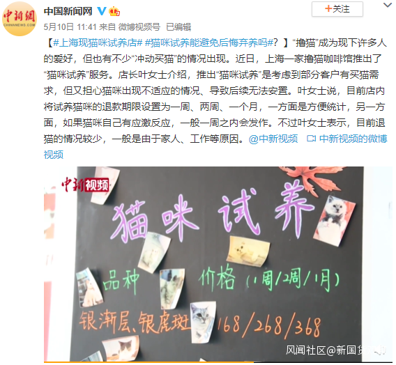 近日,上海一家擼貓咖啡館推出了“貓咪試養”服務。店長葉女士介紹,推出“貓咪試養”是考慮到部分客户有買貓需求,但又擔心貓咪出現不適應的情況、導致後續無法安置。目前店內將試養貓咪的退款期限設置為一週、兩週、一個月。