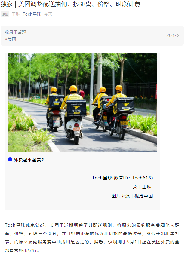 美團於近期調整了其配送規則,將原來的履約服務費細化為距離、價格、時段三個部分,並且根據距離的遠近和價格的高低收費,類似於出租車打表,而原來履約服務費中抽成則是固定的。該規則於5月1日起在美團外賣的全部直營城市實行。