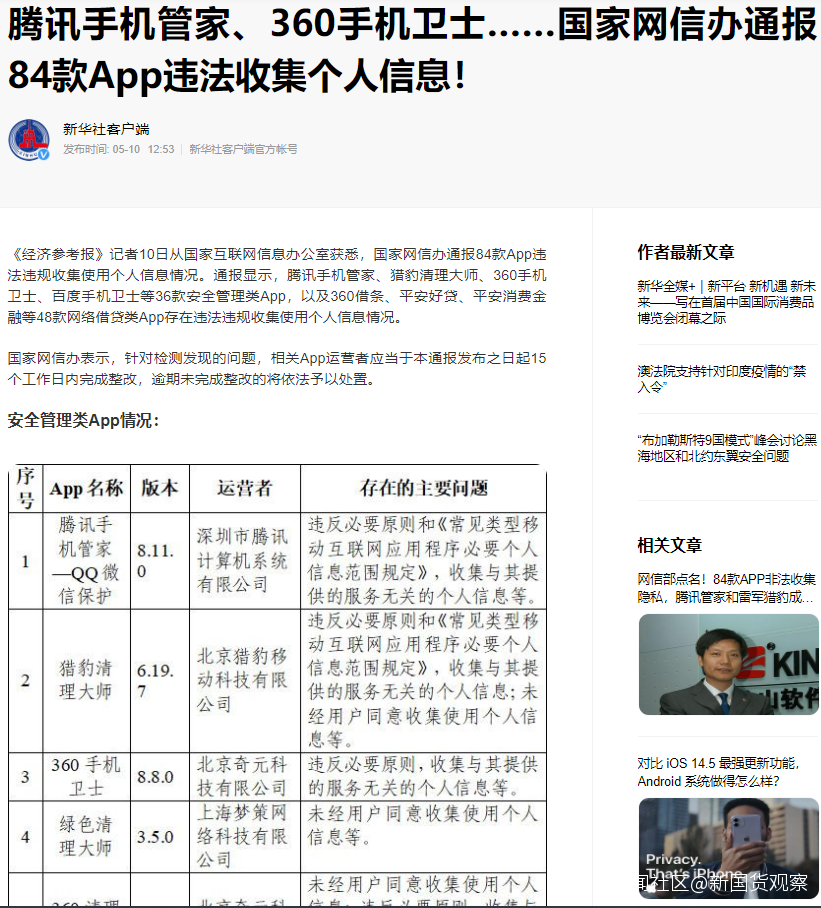 國家網信辦通報騰訊手機管家、獵豹清理大師、360手機衞士等84款App違法違規收集使用個人信息情況。