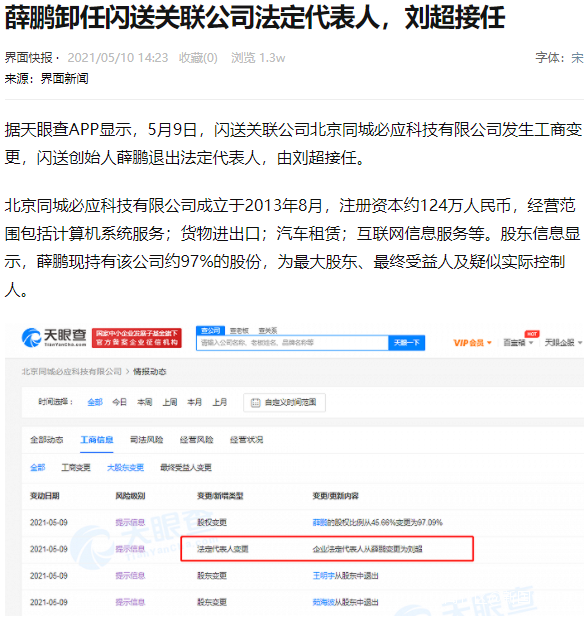 5月9日,閃送關聯公司北京同城必應科技有限公司發生工商變更,閃送創始人薛鵬退出法定代表人,由劉超接任。