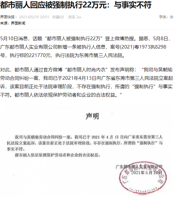 昨日,話題“都市麗人被強制執行22萬”登上微博熱搜。對此,都市麗人發佈聲明稱:“該案目前正處於法院審理階段,不存在強制執行,所謂的“強制執行”與事實不符。”
