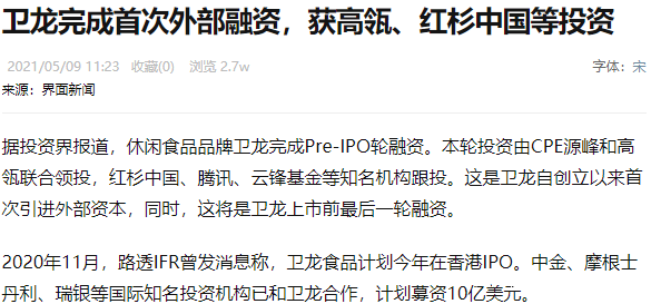 休閒食品品牌衞龍完成Pre-IPO輪融資。這是衞龍自創立以來首次引進外部資本,同時是衞龍上市前最後一輪融資。