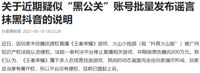 抖音回應火山小視頻被判賠償騰訊800萬,認為《王者榮耀》屬於多人在線競技類遊戲,其間的動態畫面完全由玩家操作形成,玩家應當享有著作權,所以平台沒有侵權,目前已提起上訴。