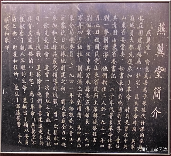 “燕翼堂”劉家在沂蒙山遠近聞名,在當地有“三名”之説,即“有錢、有地、有人氣”,我看還應該加上“有名氣”。