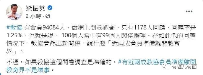 全國政協副主席梁振英也在社交媒體發文表示,教協有會員94084人(包括各種私立教育機構),做網上問卷調查,只有1178人回應,回應率僅1.25%。