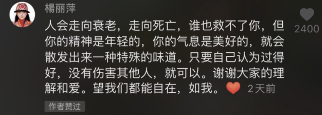 “人會走向衰老,走向死亡,誰也救不了你,但你的精神是年輕的,你的氣息是美好的。望我們都能自在,如我。”
