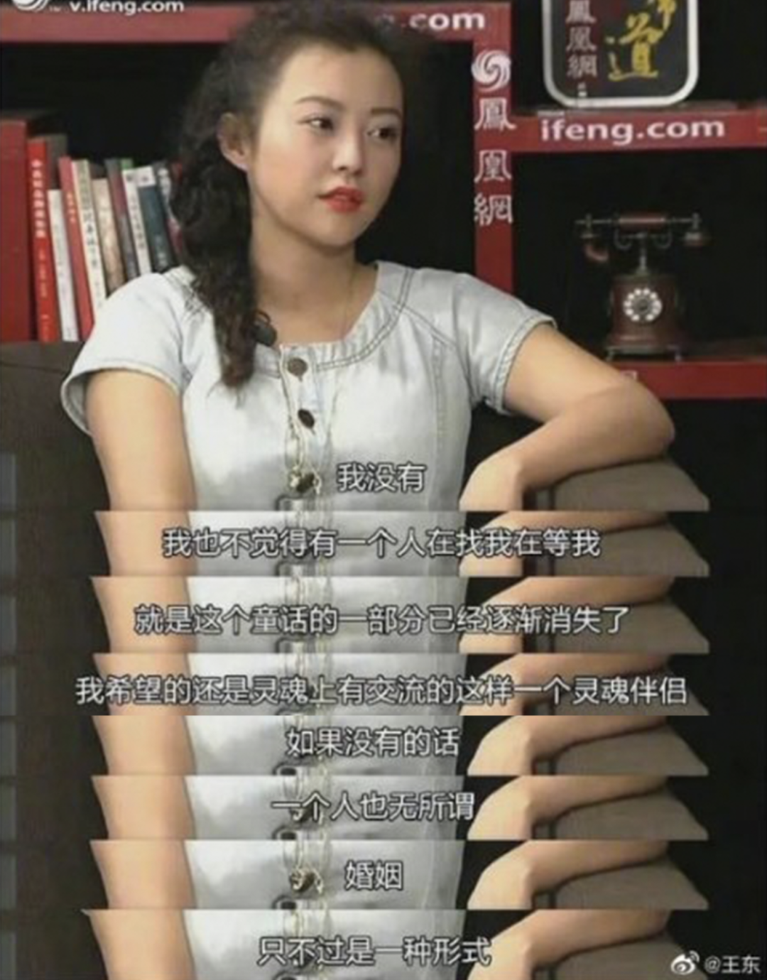 “我希望還是靈魂上有交流的伴侶。如果沒有的話,一個人也無所謂。婚姻,只不過是一種形式。”