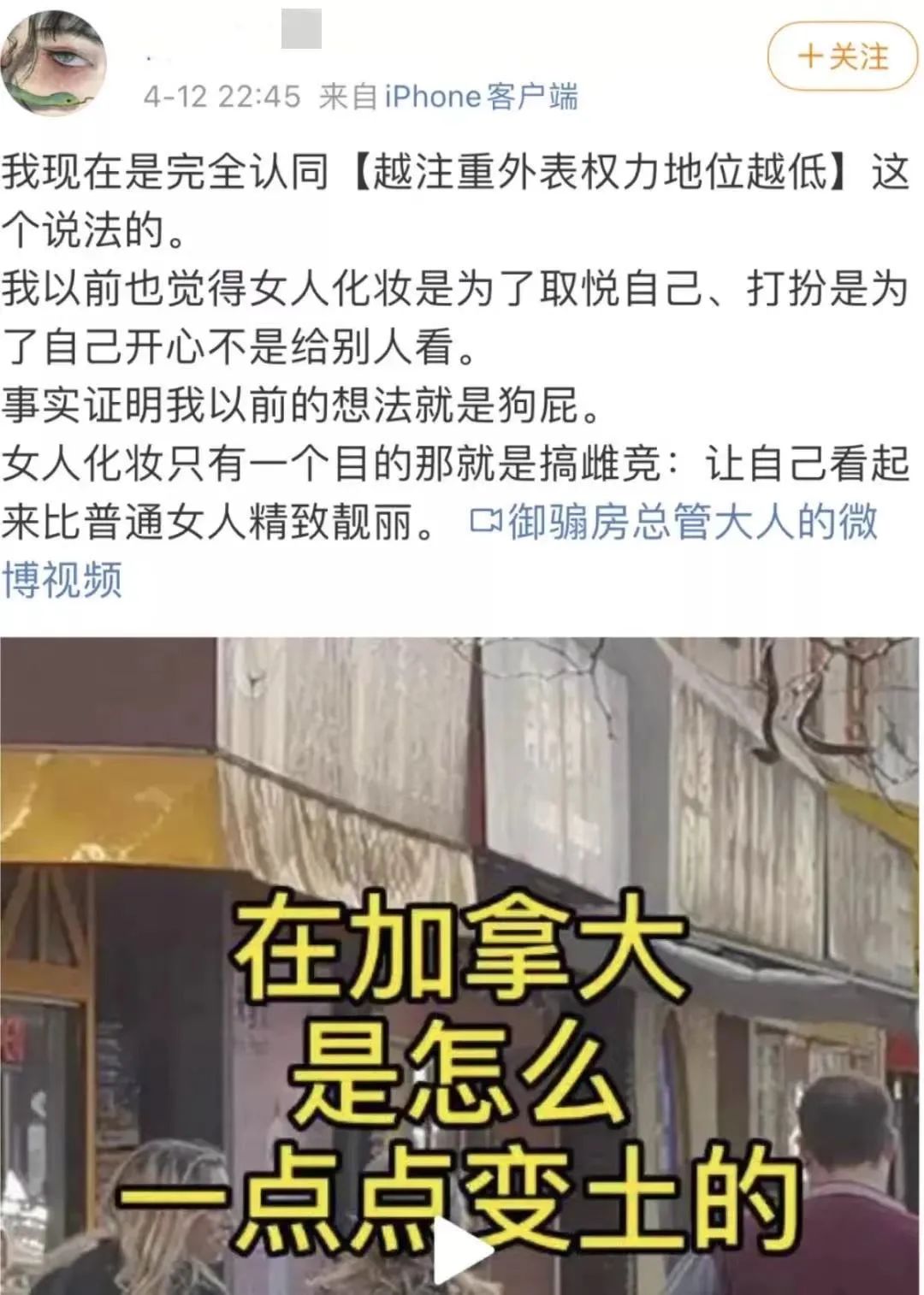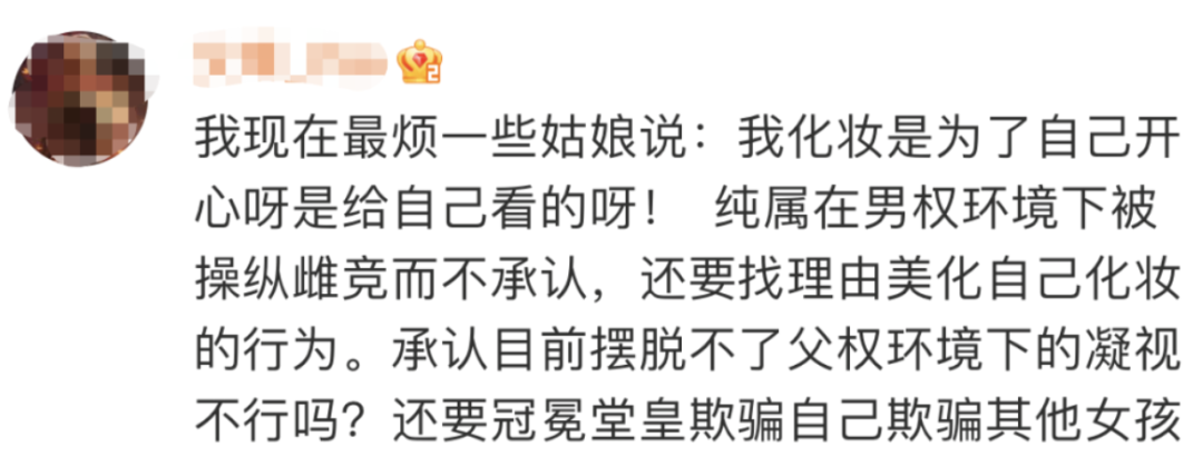 這種思維模式,首先默認了女性無論做什麼事情都是為了奪取男性施捨的資源,如果你化妝只為自己開心,那麼就是「被男性社會操控而不自知」。