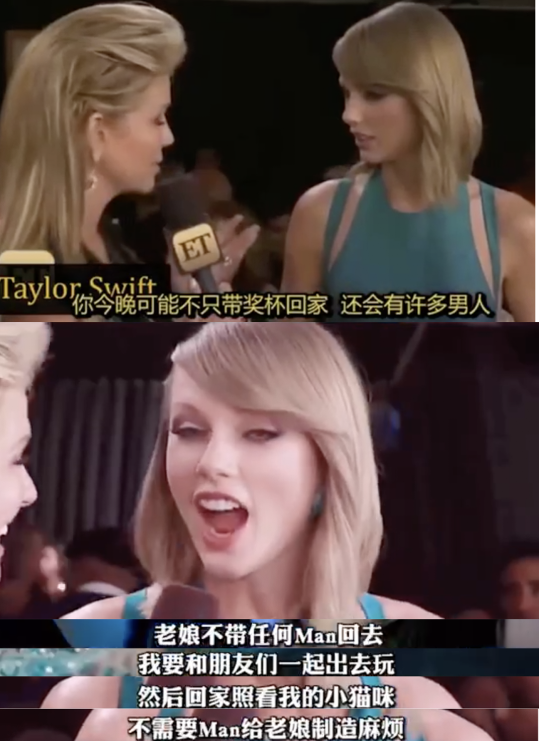 同樣的問題,記者也問過泰勒·斯威夫特,那是格萊美的現場:“你今晚不僅僅帶着獎盃回家,還會帶很多男人回去吧?”