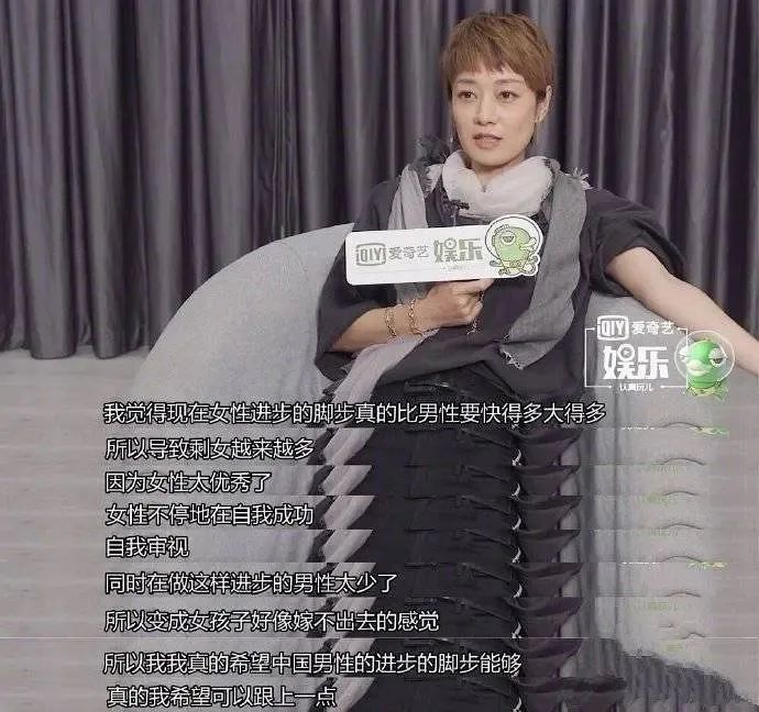 “女性太優秀了,女性不停地自我審視,與此同時這樣進步的男性太少了。所以看上去女孩嫁不出去的感覺。”
