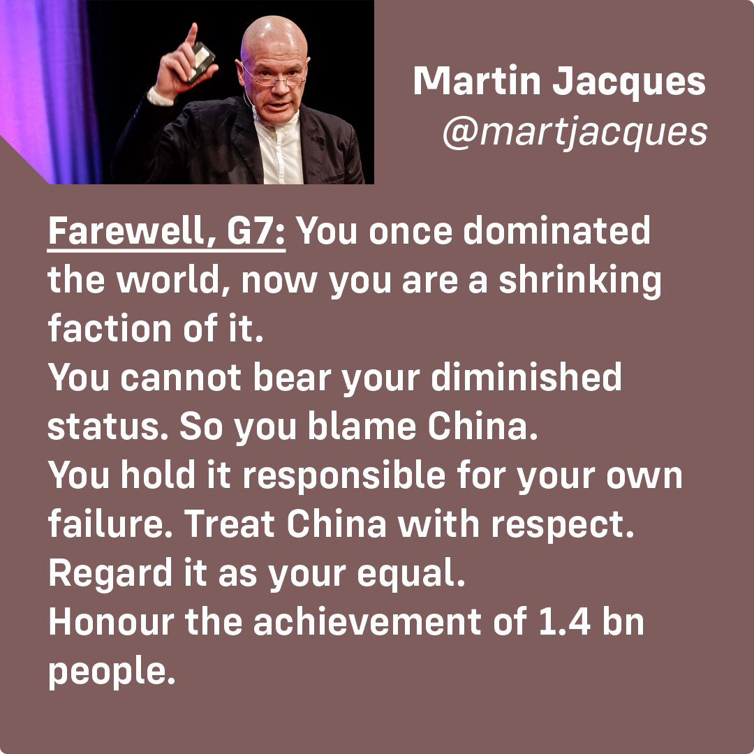 ▲英國學者馬丁•雅克在社交媒體上發帖表示:“再見了,七國集團:你們曾經主導世界,現在卻只是一個越來越小的山頭。你們不滿現在的衰頹,於是就去責怪中國。你們的失敗只能怪自己。對中國要放尊重,要平等相待。對14億人民取得的成就要心懷敬意。”