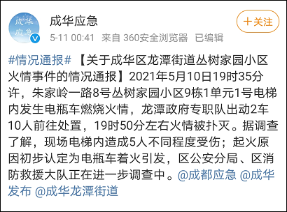 11日凌晨,成都市成華區應急管理局對此次事件進行通報。據悉,事發後,龍潭政府出動2車10人前往處置。通過調查瞭解,電梯內5人不同程度受傷,起火原因初步認定為電瓶車着火引發,區公安分局、區消防救援大隊正在進一步調查中。