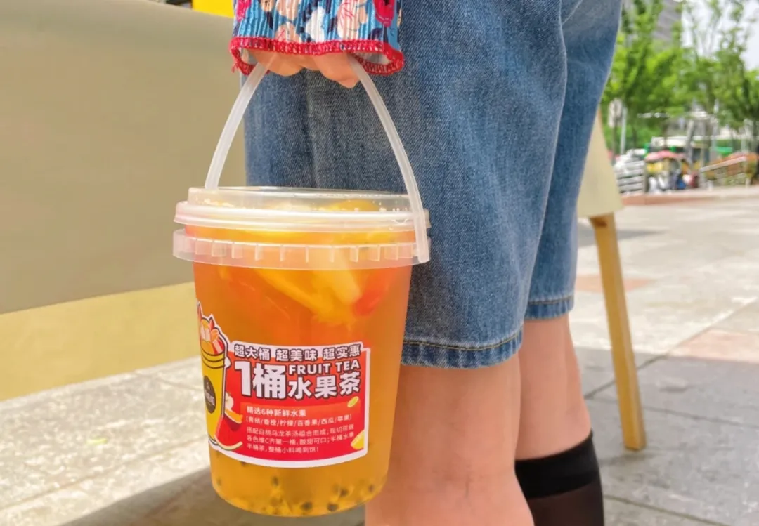 經常有人用手拎着一個“桶”,裏面裝着水果茶。這是甜啦啦的新品“1桶水果茶”,我立刻去家附近的門店點一杯嘗試。