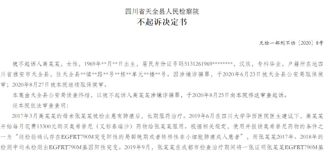 由於高某是重病患家屬,屬於特殊羣體,並且主動退還了醫保報銷費用,檢察機關沒有對其起訴。