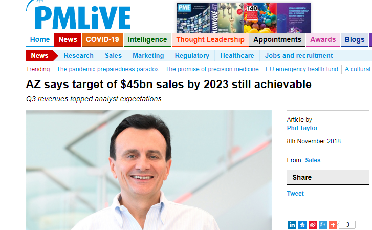2014年,阿斯利康在抵制輝瑞收購的關口,向投資者做了一項大膽的承諾,要在2023年實現450億美元的業績目標。