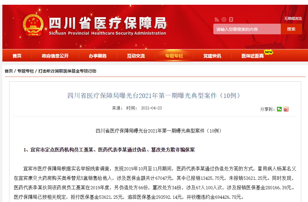 2021年4月,四川省醫保局發佈了《曝光台:2021年第一期曝光典型案件(10例)》,第一個涉案的就是阿斯利康的奧希替尼。