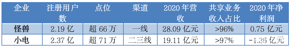 在營收、淨利潤兩項數據上,怪獸充電略勝一籌,2019-2020年營收分別為20.22億元、28.09億元,淨利潤為1.67億元和0.75億元;同期小電科技營收分別為16.36億元、19.11億元,淨利潤為1.94億元、-1.07億元。