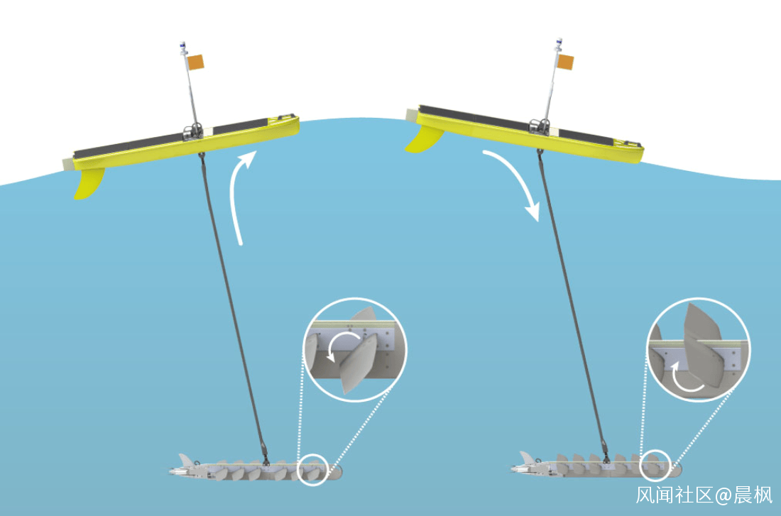 當在波浪作用下上升時,槳葉後緣自然下垂,但到45度為止,然後就像搖櫓一樣,只是往上搖;當在波浪作用下沉時,潛航體靠重量自然下沉,槳葉後緣自然上翻,同樣到45度為止,然後“櫓”往下搖。週而復始,產生前進的推力。所以波浪滑翔機實際上與滑翔沒有關係,叫波浪推進更加合理,但習慣上叫波浪滑翔機,就沿用這個稱呼了。
