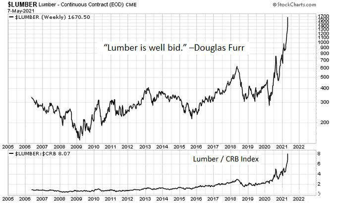 CME木材期貨本週二收報1544美元,週一曾一度突破1700美元/千板英尺。隨着木材價格的漲勢不斷領跑大宗商品,其與CRB大宗商品指數的比值已經史無前例地超過了8。