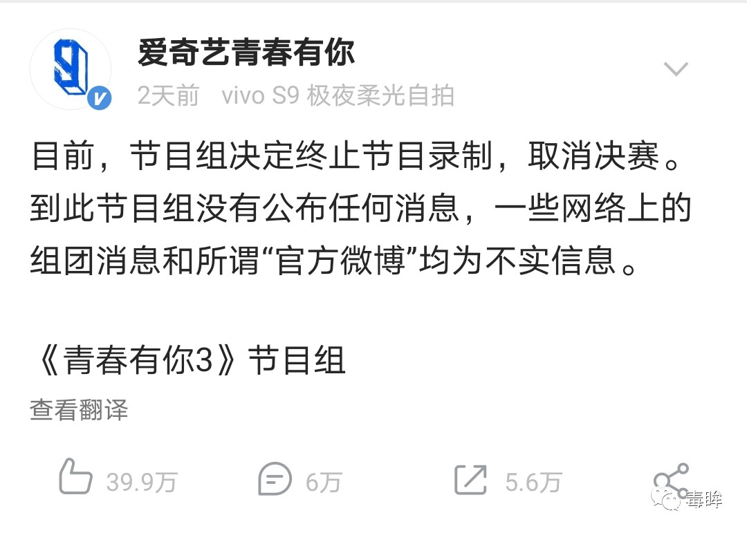 網上紛紛擾擾的揣測,也並不樂觀。在豆瓣選秀粉匯聚的小組“豆瓣艾瑪花園”,有人爆料稱“不會有決賽,也不會有任何的物料了”“青春有你這個廠牌也一起結束了”。