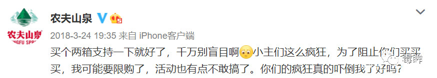 《偶像練習生》時期農夫山泉官博曾經勸導粉絲們“理智追星”的言論,也被拿出來和真果粒進行對比。憤怒的粉絲們在真果粒的道歉微博下留言:“你們把投票碼印瓶蓋裏的時候是怎麼想的?現在又怪到消費者頭上?”