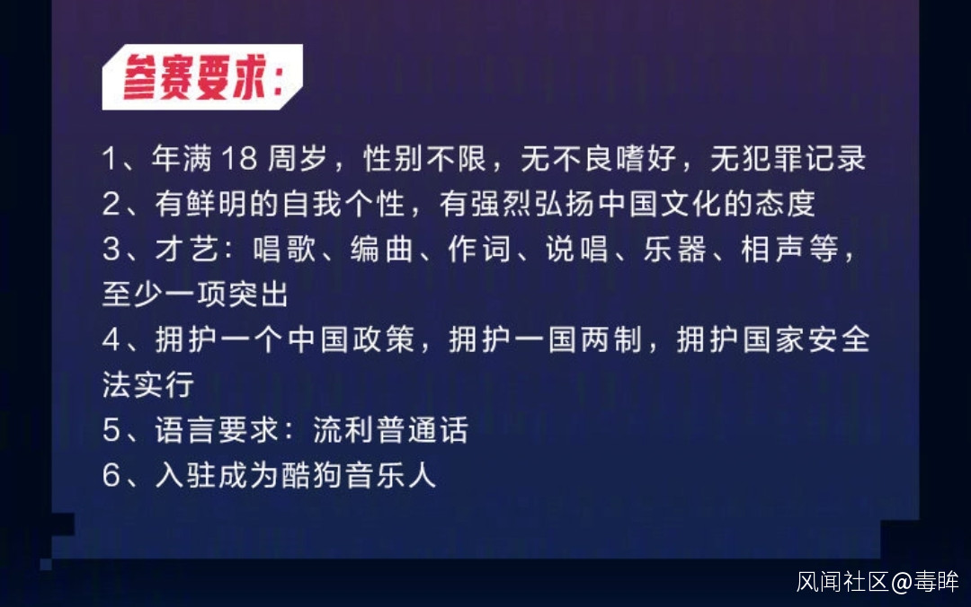 未開播的綜藝也進入了“警備狀態”。在網上流傳的優酷兩檔音樂綜藝——《亞洲超星團》《中國潮音》的選拔標準中,都出現了“無不良嗜好,無違法犯罪記錄”,其中《中國潮音》還強調“擁護一箇中國政策,擁護一國兩制,擁護國家安全法實行”,以及“流利的普通話”。“這是塌了無數個房子之後總結出的經驗嘛?”有網友戲稱。