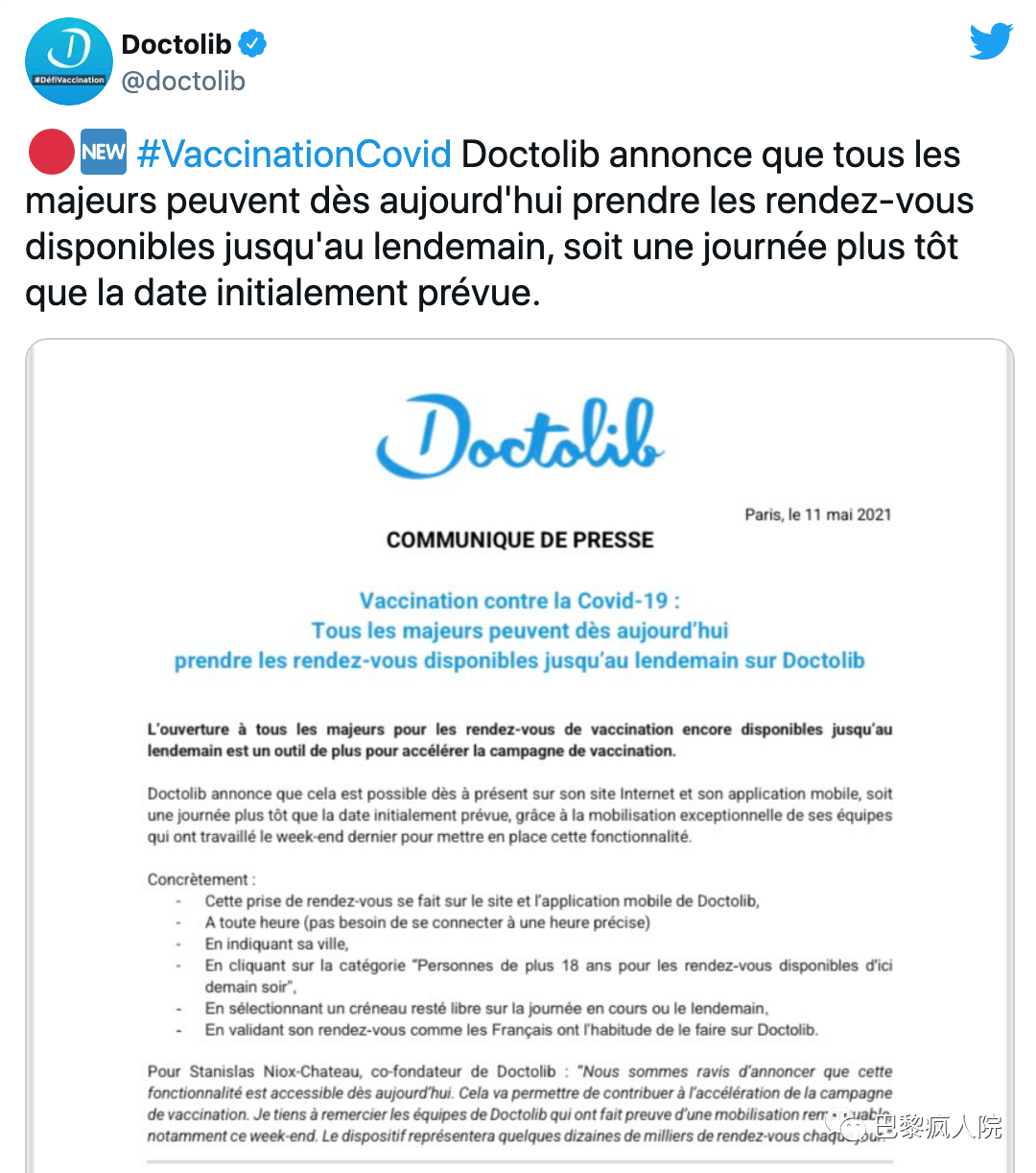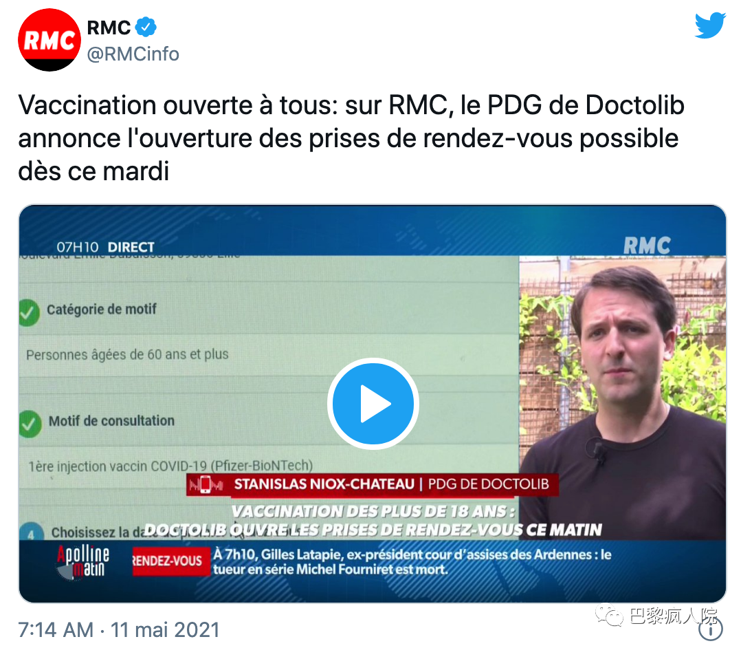Doctolib公司首席執行官Stanislas Niox-Chateau在法媒RMC採訪時宣佈,18歲以上人羣的疫苗接種預約現已正式開放!比原定5月12日提前了24小時上線!