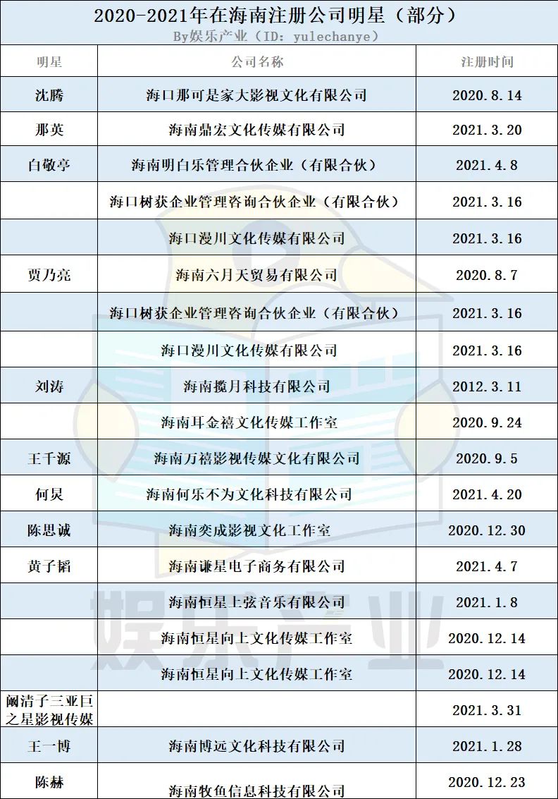 近期何炅、王一博、韓庚、陳思誠相繼在海南成立公司,包括那英、陳赫、王千源、闞清子、黃子韜、侯鴻亮、白敬亭等明星也都在海南投資了新公司。