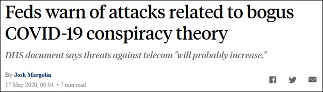 去年5月,美國國土安全部在一份情報報告中指出:“網上發佈的、聲稱無線基礎設施對人體健康有害、且有助於傳播新冠病毒的錯誤信息,已經被暴力的極端分子吸納,全球範圍內相信這種理論的人,在共謀破壞5G設施的正當性以及行動方案,其中有些人已經在宣揚,要針對美國多州的信號塔實施縱火和物理破壞行為。”