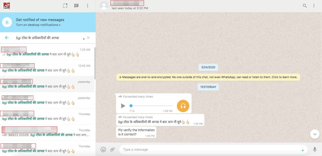 WhatsApp上流傳的“5G導致印度第二波疫情”言論 圖源:Alt News
