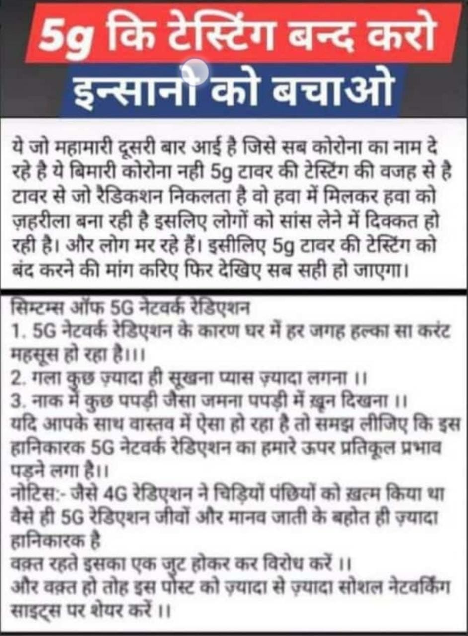 “這次疫情是第二次出現,大家都説這是新冠疫情,這是由於(印度政府)測試了5G信號塔(才導致的),而不是新冠病毒。信號塔釋放出的輻射與空氣混合,使其有毒,這就是為什麼人們會呼吸困難甚至死亡。這就是為什麼我們需要要求(印度政府)停止測試5G發射塔,然後一切都會好起來的。”