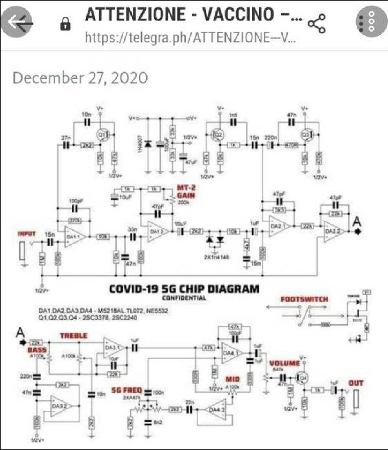 去年12月,一張所謂的“5G 芯片內部電路結構圖”在意大利社交媒體流傳,相關説法稱5G 芯片已經被藏在新型冠狀病毒疫苗中。事實上,該圖其實是Boss Metal Zone效果器電路圖。
